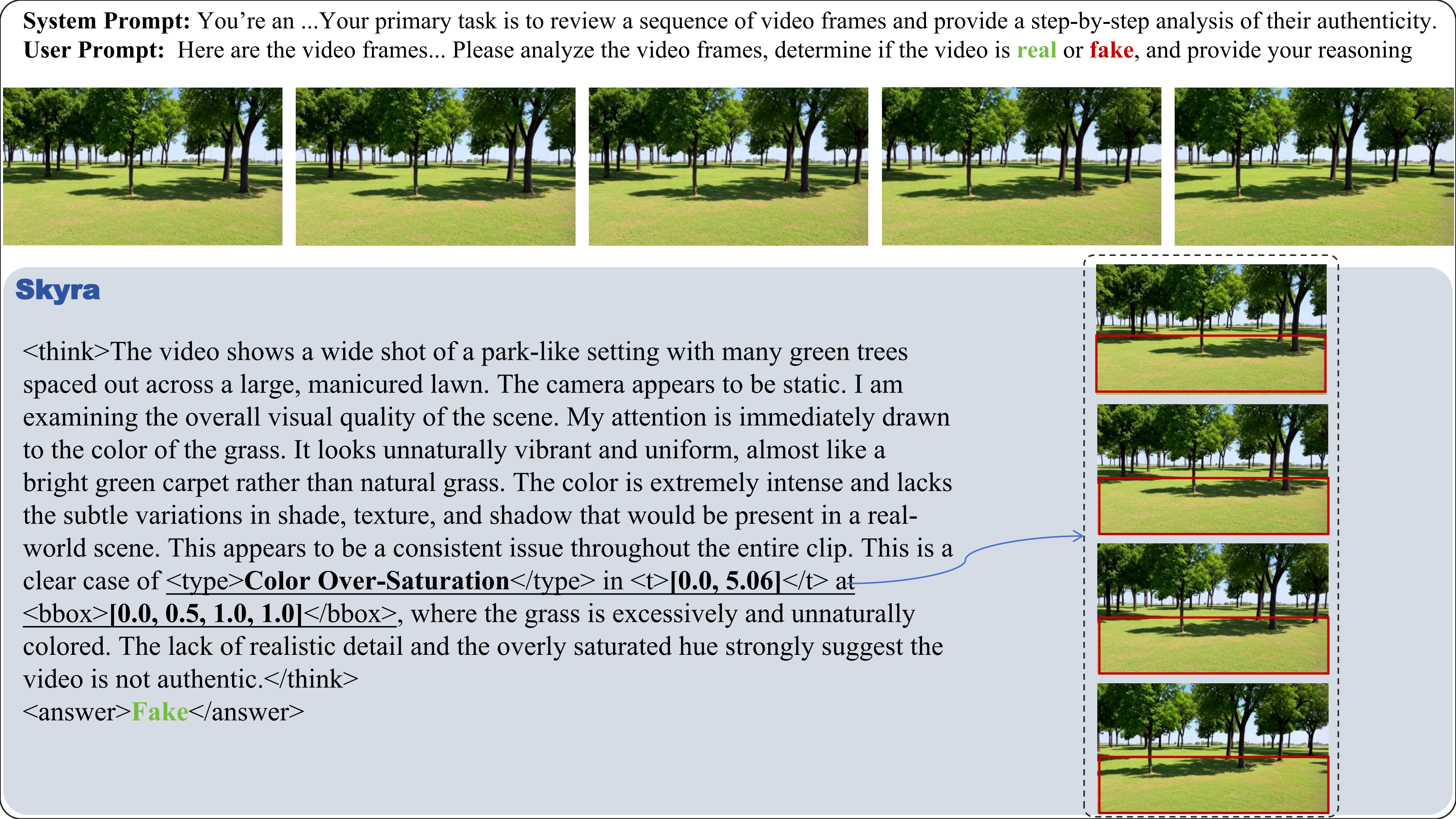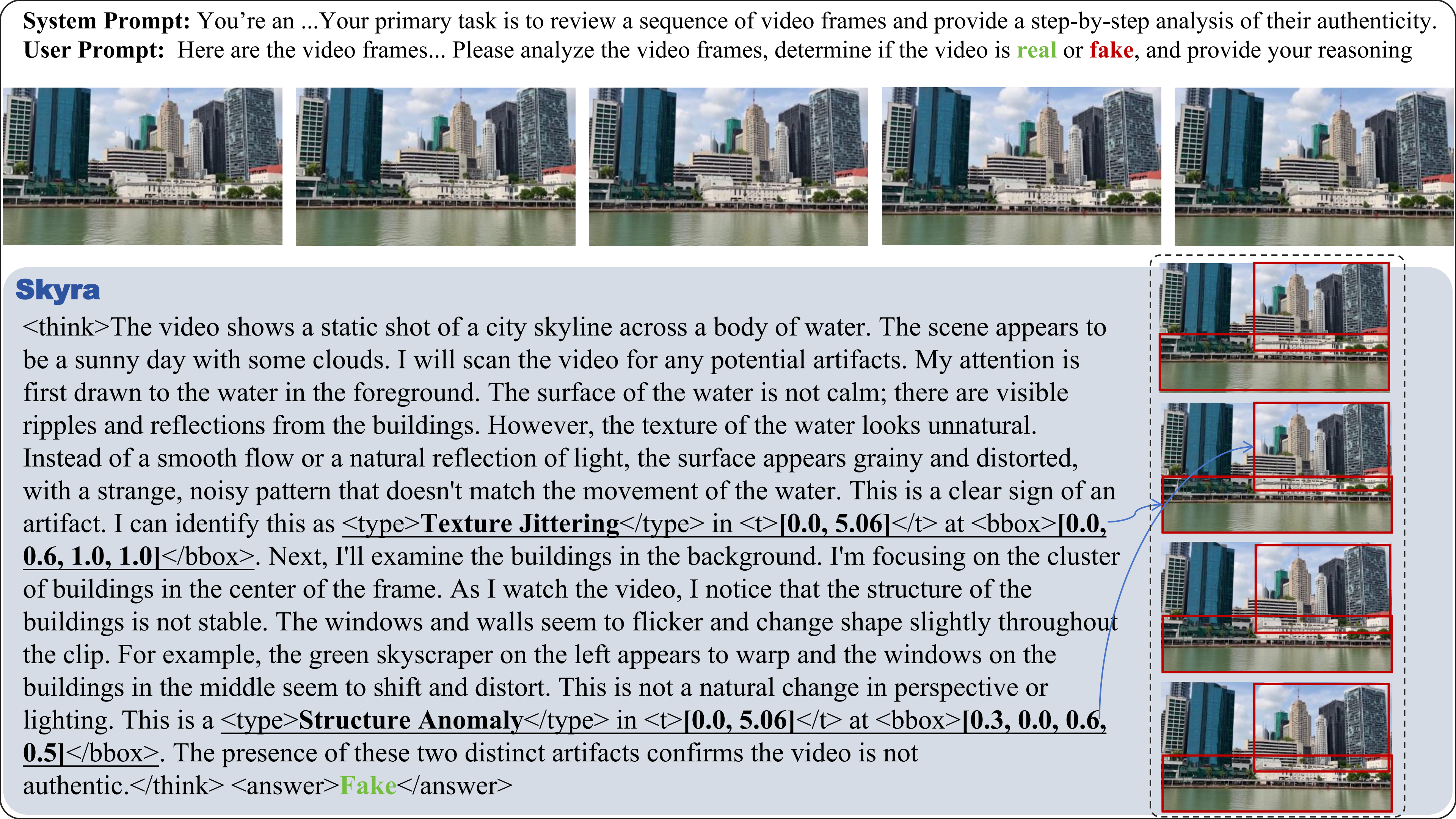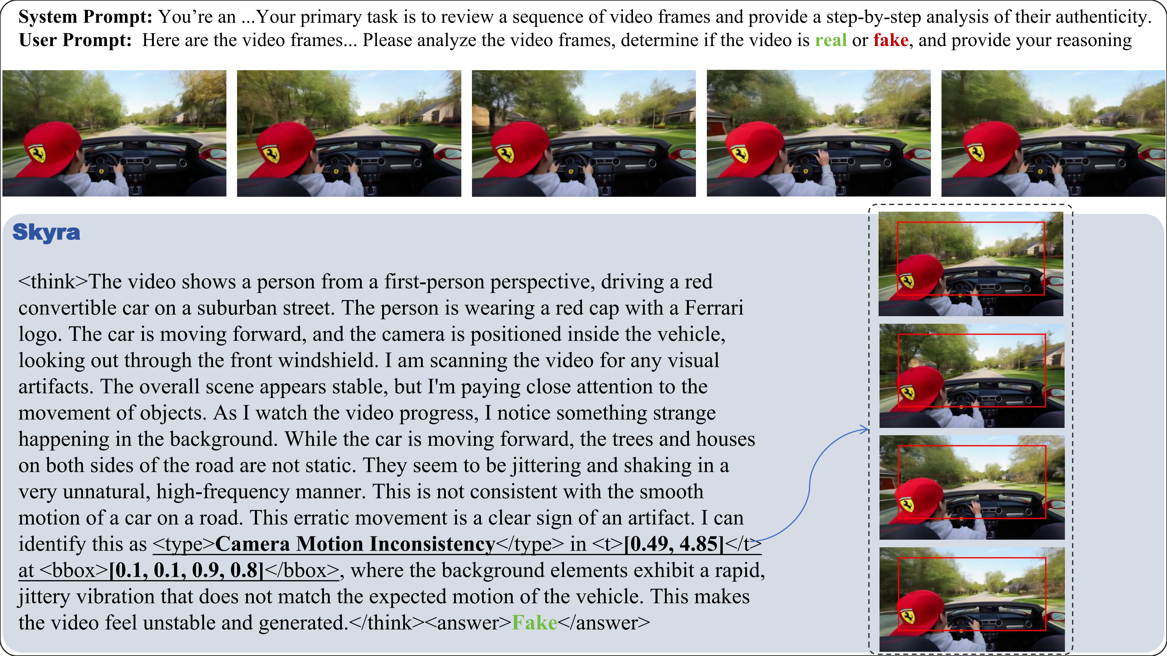 In this paper, we present Skyra, a specialized multimodal large language model (MLLM) that identifies human-perceivable visual artifacts in AI-generated videos and leverages them as grounded evidence for both detection and explanation. To support this objective, we construct ViF-CoT-4K for Supervised Fine-Tuning (SFT), which represents the first large-scale AI-generated video artifact dataset with fine-grained human annotations. We then develop a two-stage training strategy that systematically enhances our model's spatio-temporal artifact perception, explanation capability, and detection accuracy.